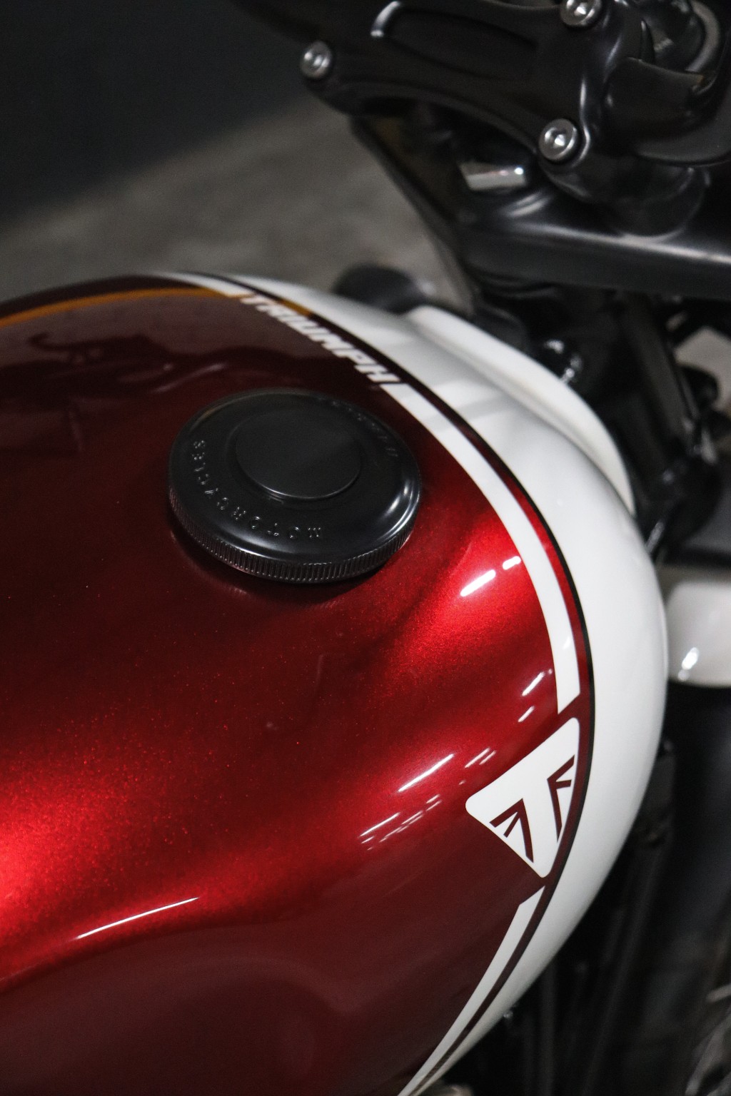O vermelho cereja profundo dialoga diretamente com a herança clássica das motos de corrida, enquanto o branco perolizado traz sofisticação e equilíbrio. O contraste não é agressivo, é intencional. Cada linha foi pensada para acompanhar o desenho original da moto, sem quebrar sua fluidez.