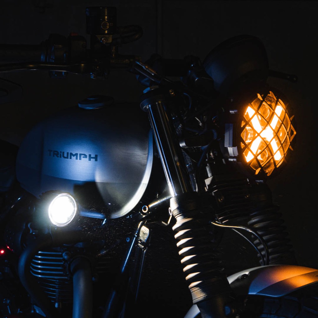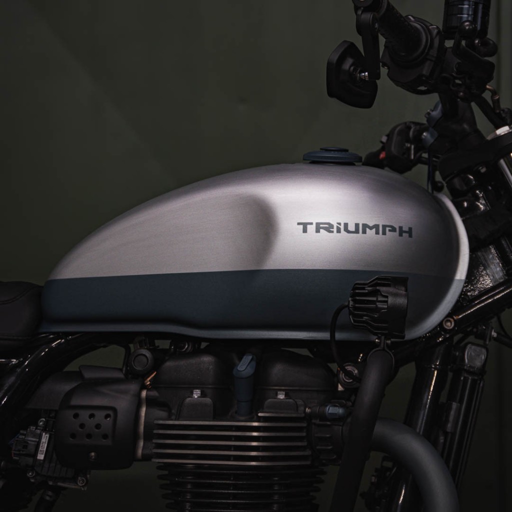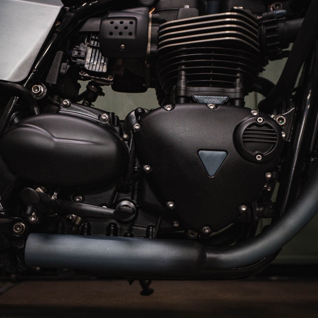 O protetor de motor e o farol auxiliar adicionam funcionalidade e reforçam o caráter urbano da Speed Twin. O escapamento exclusivo traz personalidade sonora e estética, enquanto a nova tampa lateral em metal introduz um elemento de robustez e acabamento técnico.
